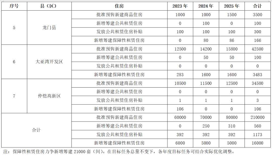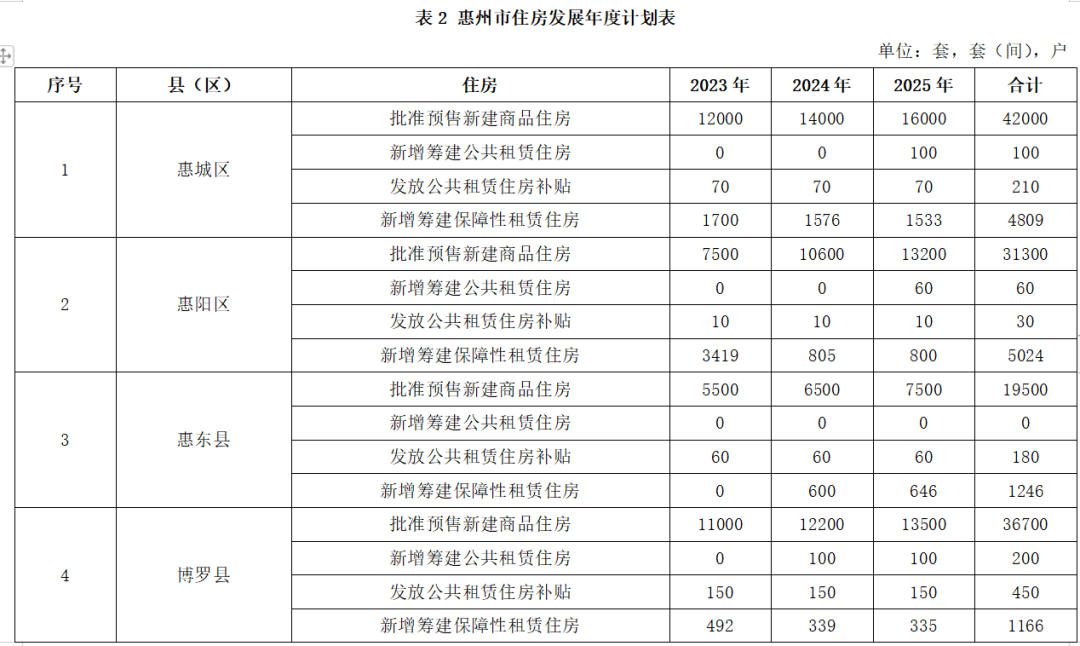 為2023至2025年全市批準(zhǔn)預(yù)售新建商品住房21萬套左右,招拍掛供應(yīng)住宅用地265公頃左右;新增籌建公共租賃住房560套,發(fā)放租賃補(bǔ)貼1173戶,新增籌建保障性租賃住房不少于16000套(間),力爭達(dá)到21000套(間);住房公積金新開戶職工人數(shù)34.25萬人,住房公積金新增繳存額170.86億元;新開工住宅綠色建筑面積占比達(dá)到100%,新增城鎮(zhèn)老舊小區(qū)改造300個(gè),為我市打造成為珠江東岸新增長極、粵港澳大灣區(qū)高質(zhì)量發(fā)展重要地區(qū)和更加幸福國內(nèi)一流城市提供有力支撐。以上目標(biāo)任務(wù)均與省城鎮(zhèn)住房發(fā)展“十四五”規(guī)劃進(jìn)行了銜接。