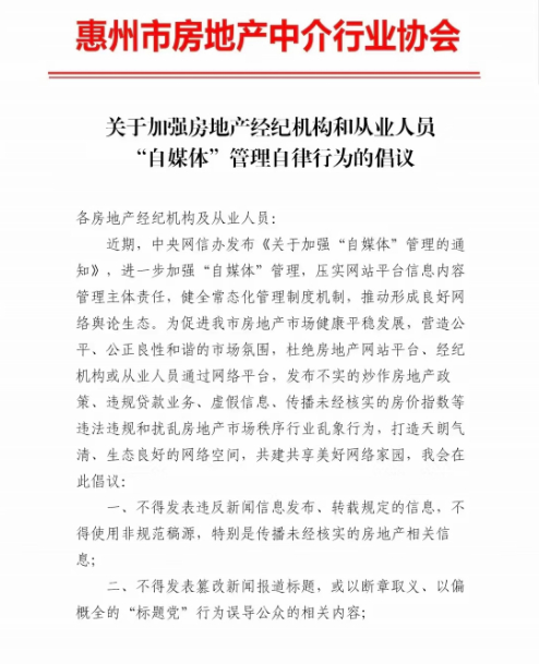 日前,記者從惠州市住房和城鄉(xiāng)建設(shè)局獲悉,在該局指導(dǎo)下,惠州市房地產(chǎn)中介行業(yè)協(xié)會(huì)正式發(fā)布《關(guān)于加強(qiáng)房地產(chǎn)經(jīng)紀(jì)機(jī)構(gòu)和從業(yè)人員“自媒體”管理自律行為的倡議》(以下簡(jiǎn)稱(chēng)《自律倡議》),倡議共同構(gòu)建天朗氣清、生態(tài)良好的網(wǎng)絡(luò)空間,為惠州房地產(chǎn)市場(chǎng)健康平穩(wěn)發(fā)展?fàn)I造公平、公正良性和諧的市場(chǎng)氛圍。