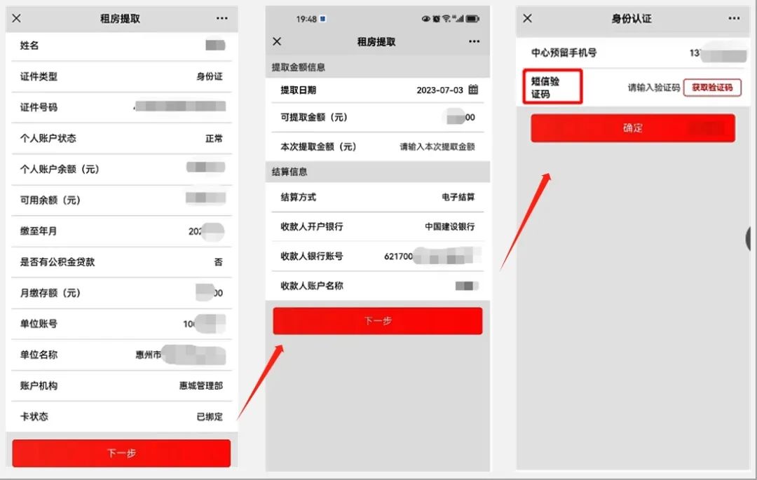 ②確認(rèn)個(gè)人公積金賬戶信息并點(diǎn)擊【下一步】按鈕;填寫本次提取金額(不能大于系統(tǒng)計(jì)算出來的可提取金額),確認(rèn)收款銀行賬戶信息并點(diǎn)擊【下一步】按鈕;在身份認(rèn)證頁面,點(diǎn)擊【獲取驗(yàn)證碼】按鈕并輸入收到的短信驗(yàn)證碼,最后點(diǎn)擊【確定】按鈕。