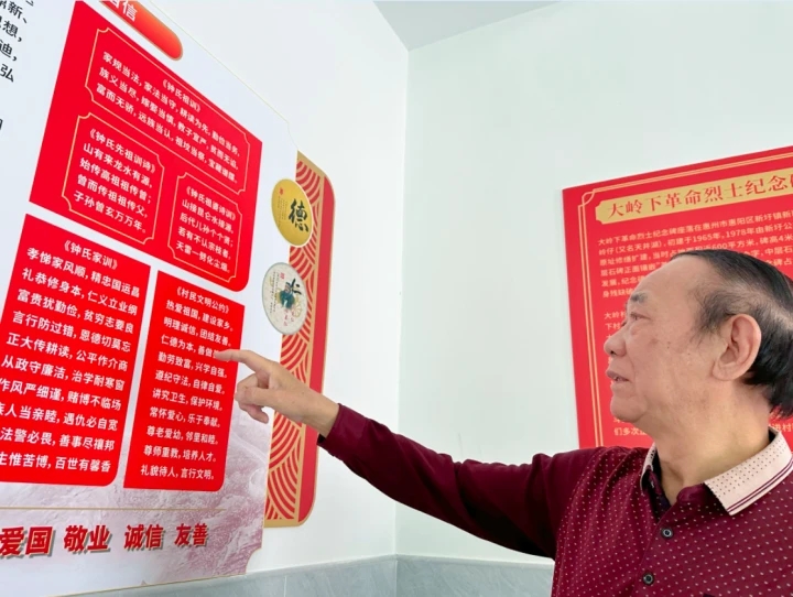 鐘建環(huán)在大嶺下紅色文化活動(dòng)中心,介紹家訓(xùn)祖訓(xùn)及相關(guān)革命故事。