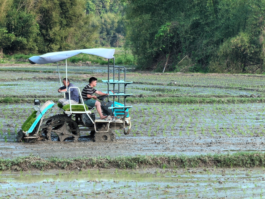 在寶口鎮(zhèn)龍坪村,駐村工作隊(duì)隊(duì)員與龍坪村黨支部書記、村委會(huì)主任謝建新一道在插秧。“有些田地因地形地勢(shì)等原因,大型機(jī)器沒辦法用上,我們只能帶著村民搶農(nóng)時(shí)、干農(nóng)活。”謝建新說。
