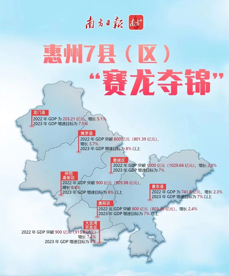 人勤春來早,奮斗正當(dāng)時(shí)。開年以來,惠州各縣(區(qū))紛紛召開縣(區(qū))委全會(huì)或高質(zhì)量發(fā)展大會(huì),公布了去年的發(fā)展成績,提出了今年乃至未來幾年的奮斗目標(biāo)和工作舉措。從中我們可以了解7個(gè)縣(區(qū))的發(fā)展現(xiàn)狀和努力方向。