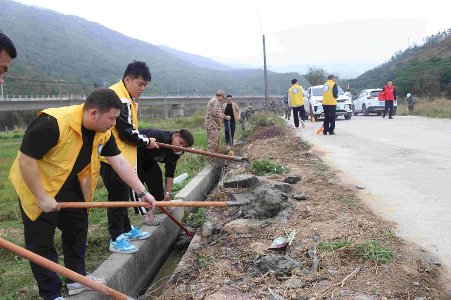 平山街道碧山村黨員干部和志愿者一起清理河道淤泥。