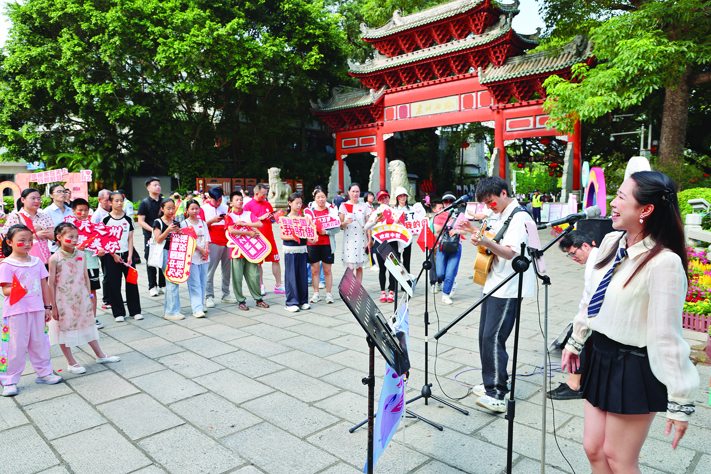 “我和我的祖國(guó),一刻也不能分割,無(wú)論我走到哪里,都留下一首贊歌……”當(dāng)日上午9時(shí),惠州西湖景區(qū)平湖門入口前,《我和我的祖國(guó)》歌曲響起,在悅耳的吉他聲中,大家伴著熟悉的旋律,高聲歌唱起來(lái),共同祝福祖國(guó)繁榮昌盛。