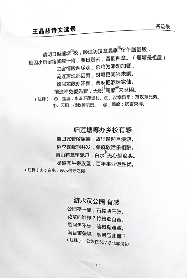 多年來,在永漢蓮塘,很多年輕一代“常聽老人們提到文人王晶慈的名字”。王晶慈的事跡,經(jīng)過后人收集、整理,先后見載于《龍門文史》(1986年)、《龍門縣志》(1995年)。后人將王偉卿、王晶慈、王一洲三代人的詩歌編為《怡廬詩集》,留下一份珍貴的文獻資料。《龍門縣麻榨約坑永漢蓮塘云鸞裔王氏族譜》(2020年)亦收錄王晶慈詩作若干,這些詩篇傳承的不僅是文化,更是一種民族精神。