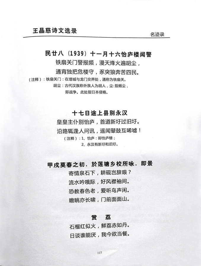 當(dāng)時,王晶慈以詩歌言“家國情懷”,寫下流離顛沛的“詩史”。在《民廿八十一月十六怡廬樓聞警》,他寫道“鐵扇關(guān)門警報頻,漫天烽火遍胡塵,通宵獨把危樓守,豕突狼奔苦四民”。鐵扇關(guān)門在增城與龍門交界處,怡廬樓為王晶慈在永漢圩住所。在次日的詩歌《十七日途上縣別永漢》中,他寫道“倉皇主仆別怡廬,首道新圩過舊圩。沿路輒逢人問訊,遙聞鼙鼓互唏噓”。隨后,在《二十日詠于縣城邸》詩中,驚魂未定的王晶慈說,“鄉(xiāng)云籠罩戰(zhàn)云中,頻見飛機屢襲空。骨肉流離蓮梗斷,七星岡里叩蒼穹。”