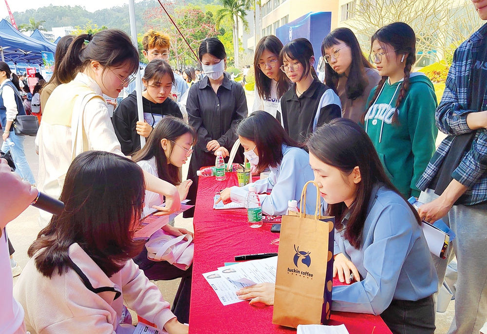 學(xué)生在招聘會(huì)上應(yīng)聘心儀的崗位。惠州日?qǐng)?bào)記者朱金贊 攝