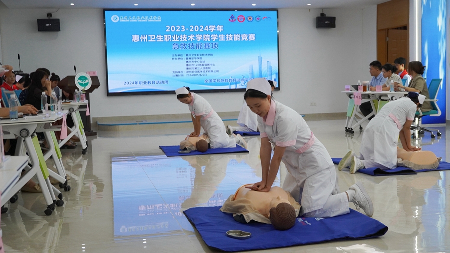 本次活動作為惠州衛(wèi)生職業(yè)技術(shù)學(xué)院2024年職業(yè)教育活動周的項目之一,除了急救培訓(xùn)外,還包括學(xué)生心肺復(fù)蘇競賽。競賽選手均為該校護理學(xué)院2023級3+2、3+證書以及2022級護理、助產(chǎn)專業(yè)的學(xué)生。他們是在完成相關(guān)實訓(xùn)操作課程后,經(jīng)過多輪篩選脫穎而出的優(yōu)秀選手。在職業(yè)教育活動周期間,惠州衛(wèi)生職業(yè)技術(shù)學(xué)院還組織了師生無償獻血和科普義診活動。