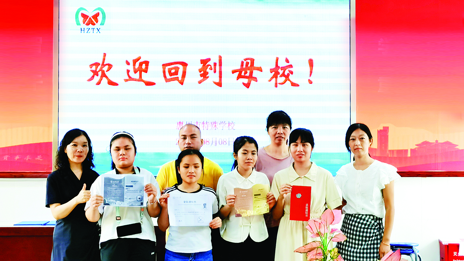 “學(xué)校的每一位老師都像對待自己的孩子一樣呵護(hù)他們。九年來,他們的點(diǎn)點(diǎn)滴滴都在我們心里。還記得在升中考試前,孩子們在大課間里積極練習(xí)跳繩和仰臥起坐等項目,最終在升中體育考試獲得全員滿分的好成績。”惠州市特殊學(xué)校老師魏亞玲是他們的英語老師,同時也是九年級畢業(yè)班班主任,更是對孩子們寄予了厚望。她希望通過他們自強(qiáng)不息的事跡,讓更多人關(guān)注、了解、接納并尊重特殊學(xué)生,讓孩子們能夠活出精彩人生。