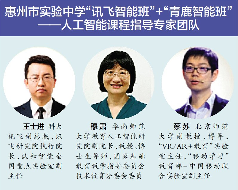 學(xué)校還特聘科大訊飛副總裁、訊飛研究院執(zhí)行院長、認(rèn)知智能全國重點(diǎn)實(shí)驗(yàn)室副主任王士進(jìn);華南師范大學(xué)教育人工智能研究院副院長、教授、博士生導(dǎo)師,國家基礎(chǔ)教育教學(xué)指導(dǎo)委員會技術(shù)教育分委會委員穆肅;北京師范大學(xué)副教授、博士生導(dǎo)師,“VR/AR+教育”實(shí)驗(yàn)室主任,“移動學(xué)習(xí)”教育部-中國移動聯(lián)合實(shí)驗(yàn)室副主任蔡蘇為學(xué)校的指導(dǎo)專家。