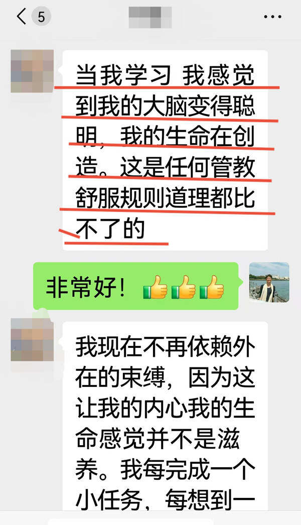 “最近我對(duì)學(xué)習(xí)狀態(tài)進(jìn)行了深入的反思、學(xué)習(xí)和思考。踐行書(shū)上的方法一段時(shí)間后,我發(fā)現(xiàn)比之前你教我的方法更加進(jìn)階。你教我后,我從厭學(xué)到喜歡學(xué);現(xiàn)在是積極地、更加有動(dòng)力地去學(xué)。現(xiàn)在當(dāng)我學(xué)習(xí)時(shí),我感覺(jué)到我的大腦變得聰明,我的生命在創(chuàng)造,這是任何管教、規(guī)則、道理都比不了的。”不久前,在國(guó)外讀研究生的學(xué)員雅(化名)與學(xué)競(jìng)分享了她的變化及最近的學(xué)習(xí)心得。