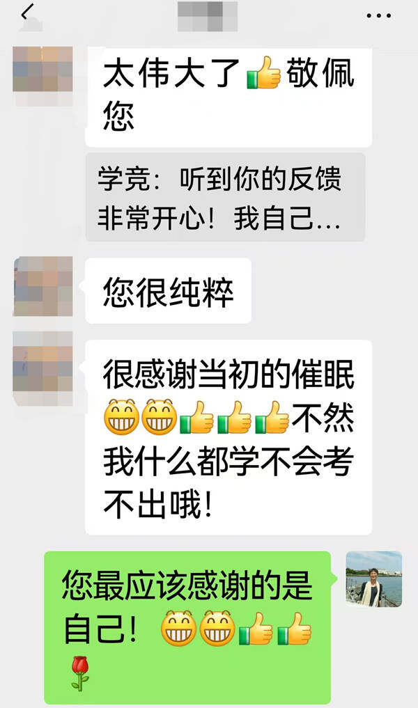 “在找你之前,我學(xué)習(xí)很差,只考了專科,經(jīng)常哭泣。學(xué)習(xí)這件事讓我很害怕,很煩,不知道該怎么辦。找你做了催眠后,這些都改變了。我現(xiàn)在留學(xué)讀研究生,每個(gè)學(xué)期都有一科要閉卷考試,全部要用筆寫(xiě)英文問(wèn)答。爸爸知道我學(xué)習(xí)很差,英語(yǔ)又不是很好,擔(dān)心我考不過(guò)。但是我都過(guò)了,沒(méi)有掛科。對(duì)我來(lái)說(shuō),這是個(gè)很大的進(jìn)步,以前我都不敢想這些事情。”