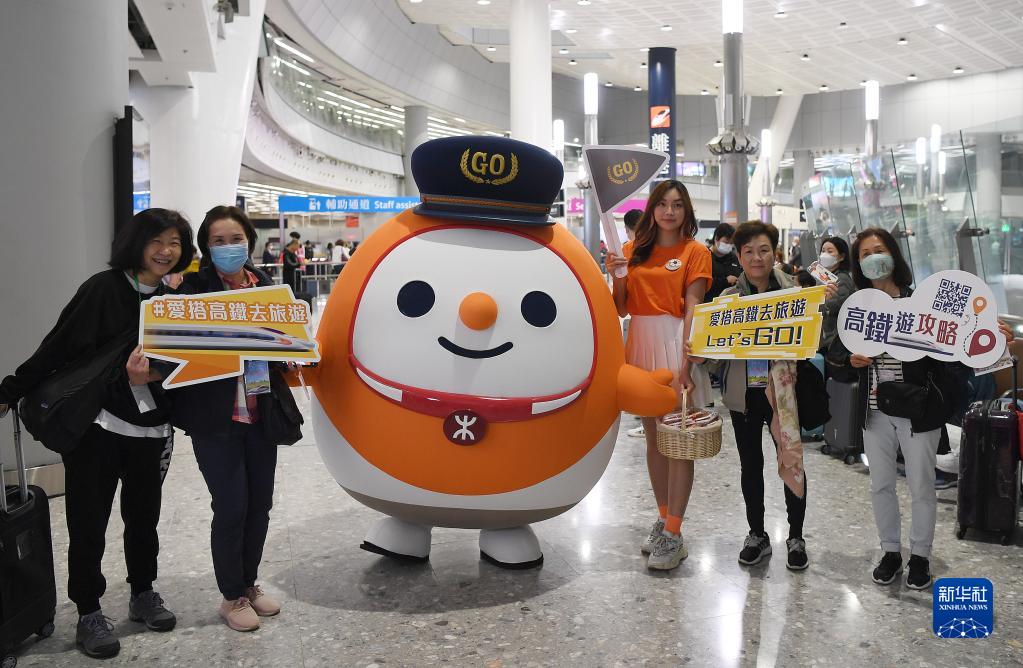 4月1日,在香港高鐵西九龍站,旅客與高鐵吉祥物“高鐵隊(duì)長”合影。新華社記者陳鐸攝
