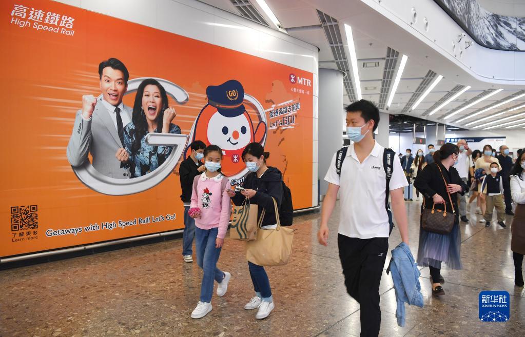 4月1日,從內(nèi)地搭乘跨省長途列車抵港的旅客走出香港高鐵西九龍站。新華社記者陳鐸攝