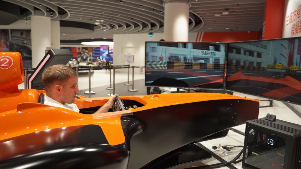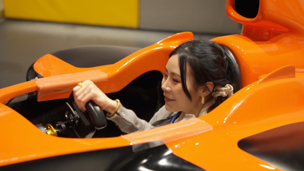 12月16日,參訪團(tuán)成員熊素婉體驗(yàn)三級方程式模擬駕駛器。新華社發(fā)
