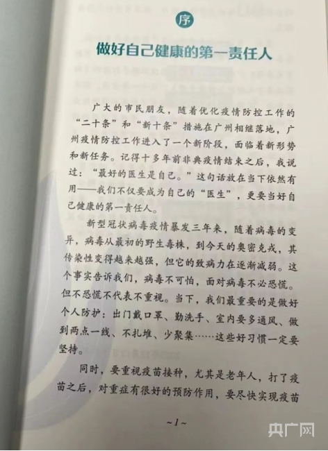 值得一提的是,共和國勛章獲得者、中國工程院院士鐘南山領(lǐng)銜專家團(tuán)隊,參與到《手冊》的編撰和審讀當(dāng)中,院士本人還為《手冊》作序推薦,囑咐市民朋友:“最好的醫(yī)生是自己”“我們不僅要成為自己的‘醫(yī)生’,更要當(dāng)好自己健康的第一責(zé)任人”。