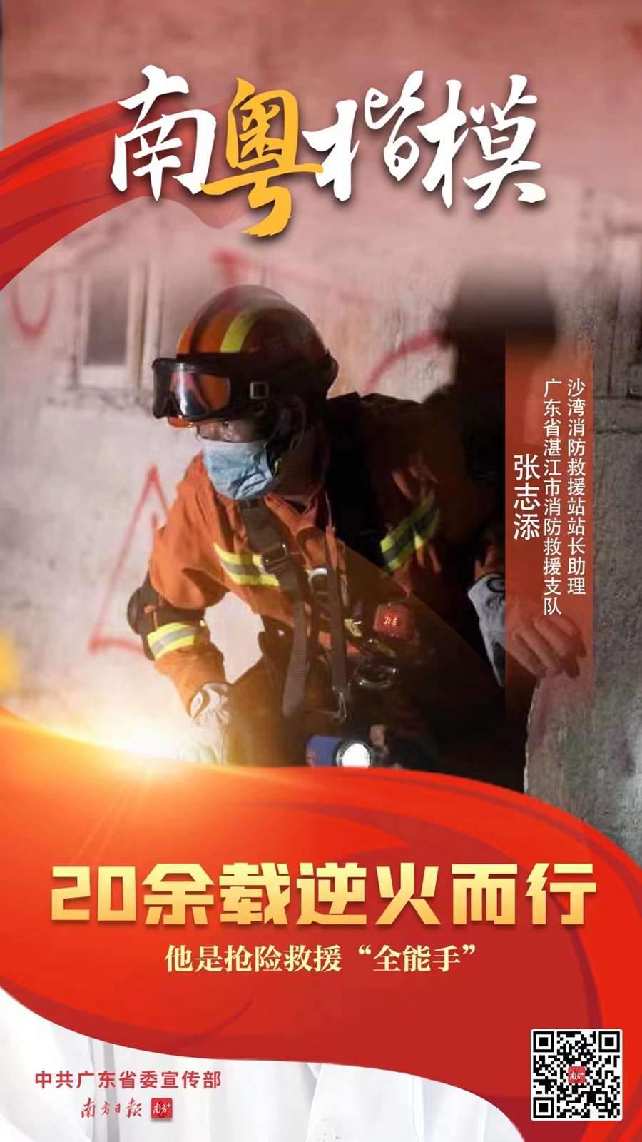 張志添個(gè)子不高,臉龐黝黑,眼睛里時(shí)常透露出堅(jiān)毅。他是廣東消防救援隊(duì)伍中公認(rèn)的“消防鐵教頭,駐地守夜人”,在隊(duì)友印象中,他不是在救援現(xiàn)場(chǎng),就是在去現(xiàn)場(chǎng)的路上;在兒子的作文里,他是經(jīng)歷過(guò)風(fēng)雨,平凡又偉大的英雄;而在自己心中,他只是全國(guó)消防隊(duì)伍的一分子,一顆扭在基層一線的“螺絲釘”,只要在崗一分鐘,自己就會(huì)鉚足勁鉆下去。近日,他獲授“南粵楷模”稱號(hào)。