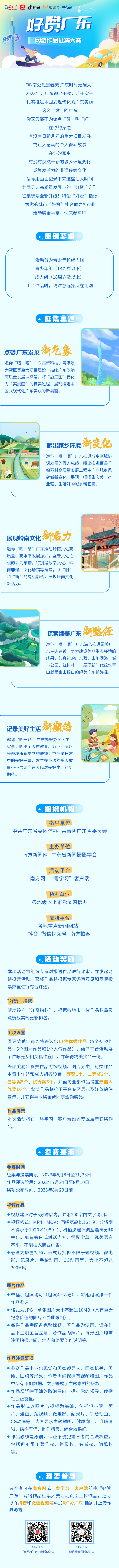 由廣東省委網(wǎng)信辦、共青團廣東省委員會指導,南方新聞網(wǎng)、廣東省新聞攝影學會主辦開展的“好贊廣東”——網(wǎng)絡作品征集大賽于5月8日正式啟動,旨在展現(xiàn)廣東奮力推進中國式現(xiàn)代化廣東實踐的新局面新氣象。