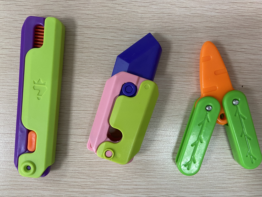 別看“蘿卜刀”肉肉墩墩、胖胖乎乎的,刀頭也是軟塑料制造的,直接傷害力不強,但是,它卻是不折不扣地還原了管制刀具——彈簧刀(跳刀)——的結(jié)構(gòu):可以單手操作彈出“刀刃”,并且鎖定“刀刃”,還能發(fā)出機械結(jié)構(gòu)碰撞的“啪嗒”聲。