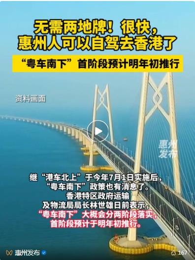 香港特別行政區(qū)運(yùn)輸及物流局局長日前表示,“粵車南下”大概會(huì)分兩階段落實(shí),首階段預(yù)計(jì)于明年初推行。