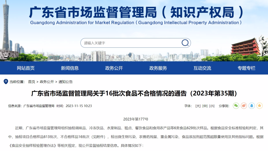 近日,廣東省市場監(jiān)督管理局發(fā)布關(guān)于16批次食品不合格情況的通告(2023年第35期),詳情如下: