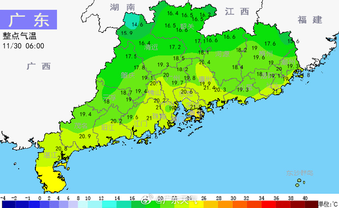 今天,廣東中西部市縣有小雨和(輕)霧,最低氣溫有所下降。根據(jù)預(yù)報(bào),粵西、珠三角、韶關(guān)、清遠(yuǎn)、云浮陰天間多云有小雨和(輕)霧,其余市縣多云為主有零星小雨和(輕)霧。最低氣溫:粵北的北部市縣9~11℃,南部沿海市縣17~20℃,其余市縣13~16℃。