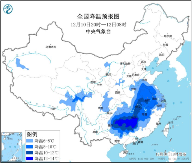 預(yù)計,受強(qiáng)冷空氣影響,12月11日至12月12日8時,西藏東北部、川西高原北部、黃淮南部、江淮、江漢東部、江南中西部、貴州東部、華南北部等地大部將先后降溫6℃-8℃。山西南部、河南北部、遼寧東南部等地的部分地區(qū)有暴雪。