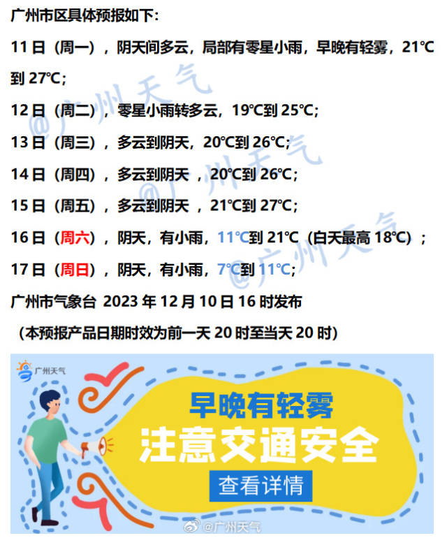 按廣州市氣象臺的一周天氣預(yù)測看,16日(周六)、17日(周日)廣州最低氣溫將從前一天的20℃左右驟降至7℃-11℃。大家可以提前準(zhǔn)備起防寒的衣物了。
