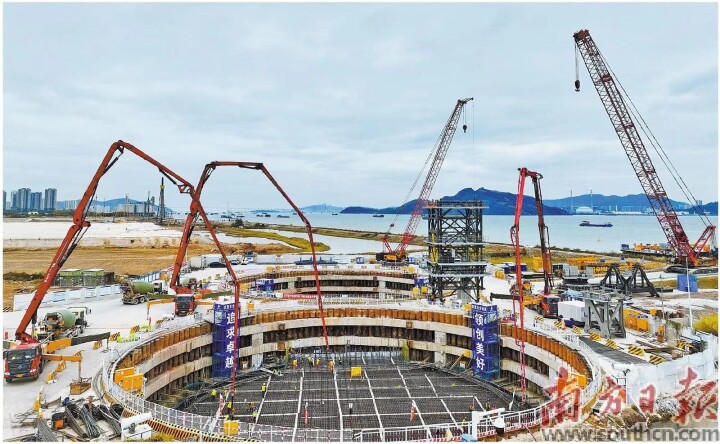 獅子洋大橋東主塔左幅承臺澆筑現(xiàn)場。南方日報(bào)記者 石磊 通訊員 雷健 攝