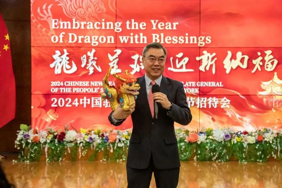 1月16日,駐紐約總領(lǐng)事黃屏和夫人在總領(lǐng)館舉辦2024年美東“歡樂春節(jié)”啟動儀式招待會,同美東文化、體育、旅游、僑學(xué)、媒體和文化贊助等各界嘉賓逾200人歡聚一堂,共同開啟龍年新春慶祝活動。儀式現(xiàn)場擺放的2024“歡樂春節(jié)”生肖吉祥物“吉祥龍”成為“團寵”,嘉賓們紛紛與之合影留念。