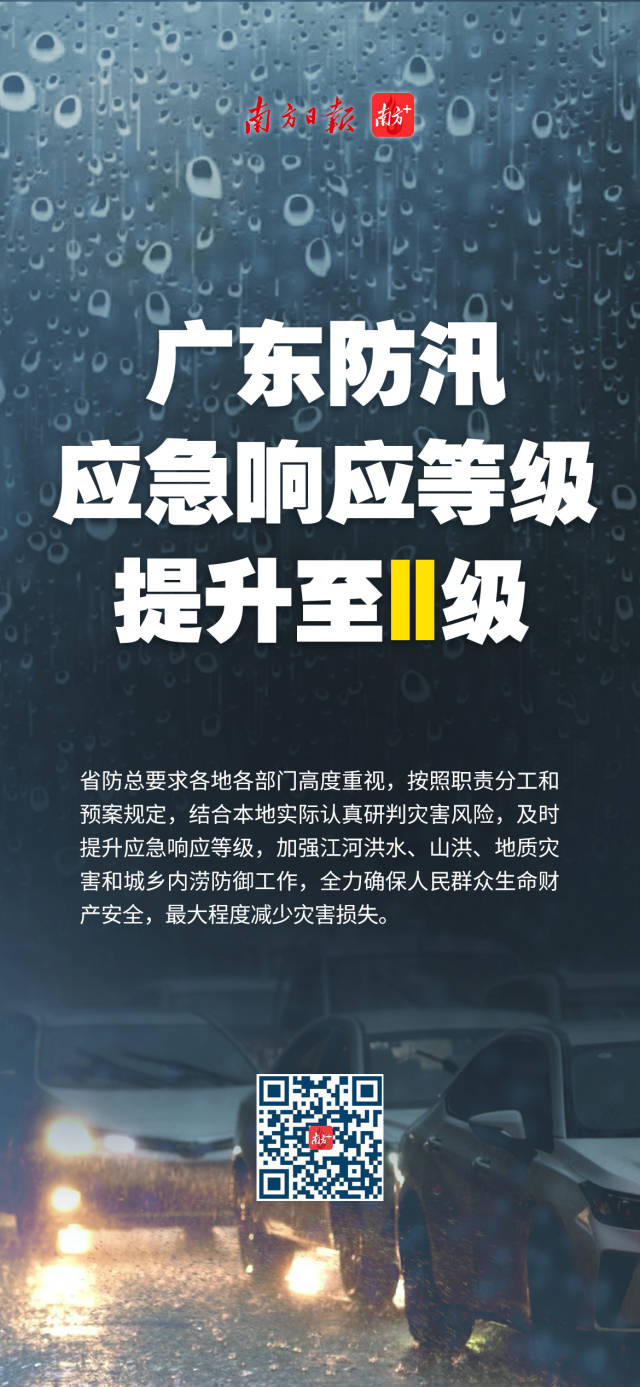 根據(jù)氣象、水文部門監(jiān)測預(yù)報,廣東省中北部市縣多地出現(xiàn)大暴雨、局部特大暴雨,江河洪水快速上漲,且未來強(qiáng)降雨過程將持續(xù),防汛形勢十分嚴(yán)峻。根據(jù)《廣東省防汛防旱防風(fēng)防凍應(yīng)急預(yù)案》和省防總有關(guān)規(guī)定,廣東省防汛防旱防風(fēng)總指揮部決定于4月20日18時將防汛Ⅲ級應(yīng)急響應(yīng)提升至Ⅱ級。