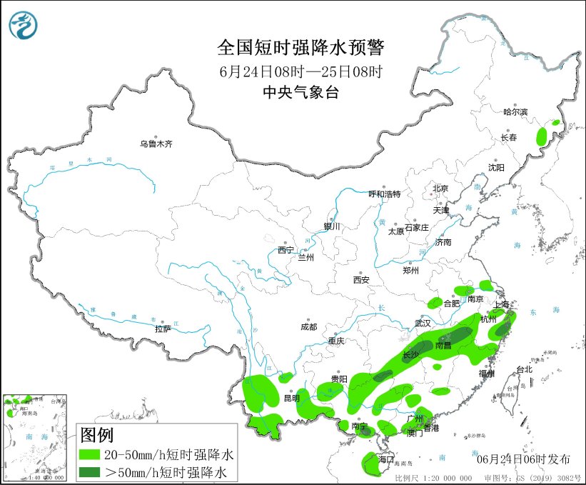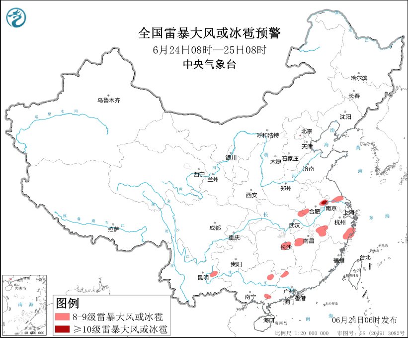 據(jù)中央氣象臺網(wǎng)站消息,預(yù)計6月24日8時至25日8時,安徽中部、江蘇中南部、湖北東北部、湖南中部、江西中北部、浙江東南部、云南東北部、廣西東部、廣東北部等地的部分地區(qū)將有8級以上雷暴大風(fēng)或冰雹天氣,其中,安徽中部局地將有10級以上雷暴大風(fēng),最大風(fēng)力可達(dá)11級以上;吉林東部、安徽中南部、江蘇中南部、湖南中南部、江西中北部、浙江、福建北部、貴州南部、云南中西部和東南部、廣西、廣東中西部、海南島西部等地的部分地區(qū)將有小時雨量大于20毫米的短時強降水天氣,其中,湖南東部和西南部、江西中北部、浙江東部、廣西東北部和南部等地的部分地區(qū)小時雨量大于50毫米,最大可達(dá)70毫米以上。中央氣象臺6月24日6時繼續(xù)發(fā)布強對流天氣藍(lán)色預(yù)警。