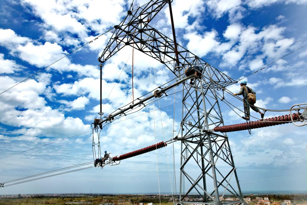 臺(tái)風(fēng)后,搶修人員正在對(duì)湛江徐聞重點(diǎn)線路——500千伏福徐線受損跳線以及絕緣子進(jìn)行緊急更換。(廣東電網(wǎng)供圖)