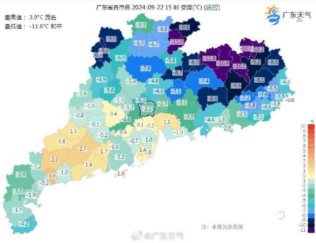 受冷空氣和降雨影響,截至22日15時,粵北、珠三角、粵東地區(qū)氣溫普遍低于30℃,氣溫最低的和平錄得21.9℃,同比21日15時下降11.8℃。