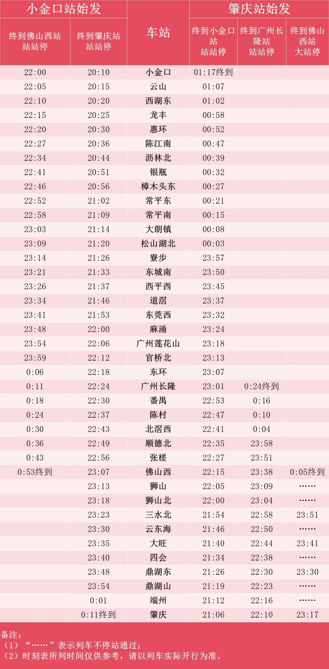 小金口往肇慶方向的站站停末班車(chē)在小金口站的發(fā)車(chē)時(shí)間將延長(zhǎng)至20:10,在肇慶站的到達(dá)時(shí)間將延長(zhǎng)至次日0:11;往佛山西站方向的站站停末班車(chē)在小金口站的發(fā)車(chē)時(shí)間將延長(zhǎng)至22:00,在佛山西站的到達(dá)時(shí)間將延長(zhǎng)至次日0:53。