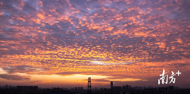 受臺(tái)風(fēng)“康妮”影響,10月30日,火燒魚鱗云映紅了廣州的天。南方+記者 蘇韻樺 攝