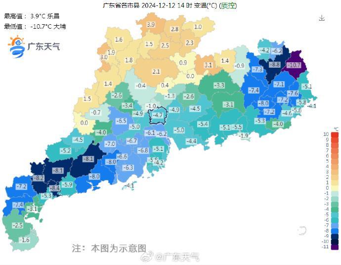 12日14時(shí),清遠(yuǎn)、韶關(guān)北部氣溫在11~14℃,河源、梅州、珠三角西部氣溫在15~18℃,其余地區(qū)氣溫18~22℃,最大降幅同比11日下降8~10℃。