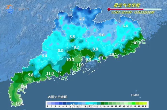 20日,全省晴間多云。最低氣溫:粵北市縣2~6℃(高海拔山區(qū)零下3~1℃),部分山區(qū)市縣有霜(冰)凍,粵西市縣10~13℃,其余市縣6~10℃。