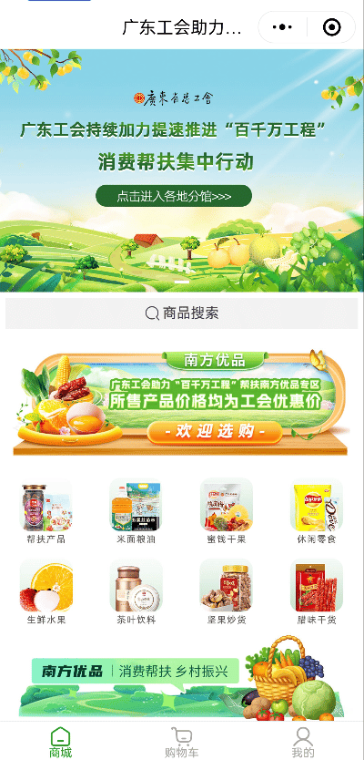 目前,廣東工會助力“百千萬工程”幫扶平臺推出三大平臺(專區(qū)),共同為消費者提供優(yōu)質(zhì)的農(nóng)產(chǎn)品,同時也為“百千萬工程”的推進貢獻力量。它們分別是廣東工會助力“百千萬工程”幫扶平臺、廣東工會助力“百千萬工程”幫扶南方優(yōu)品專區(qū)、廣東工會助力“百千萬工程”幫扶南粵分享匯專區(qū) ,均可通過“微信小程序”搜索相應(yīng)名稱進入《廣東工會持續(xù)加力提速推進“百千萬工程”消費幫扶集中行動》活動專題。
