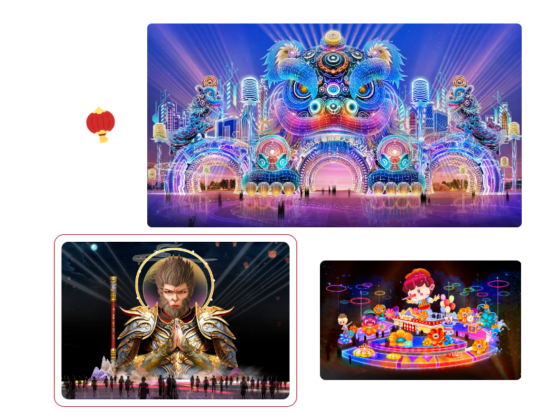 △分別為《賽博醒獅》燈組、《齊天大圣》原創(chuàng)燈組、《真心話大冒險》樂園燈組效果圖