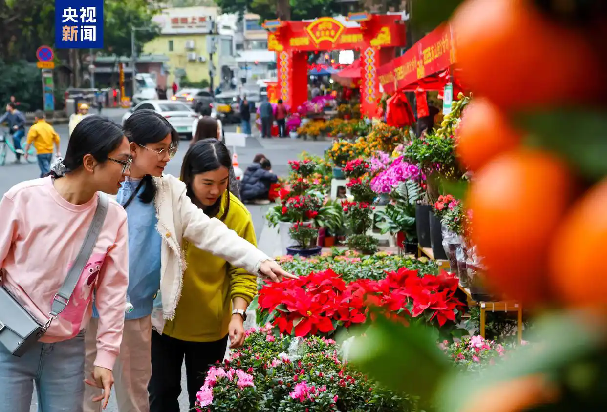 好一片熱鬧的新春氣象。在廣州中心城區(qū)的鬧市里,換上了喜慶的紅裝,燈籠、揮春、福畫、海味干果等洋溢著年味滿滿的過年氣氛,市民三五結(jié)伴、一家?guī)卓谙喟橘徺I年花、年貨,大家一同挑選心儀的年花、年貨,同時(shí)也是一家人共同許下對(duì)新的一年共同的美好愿景。