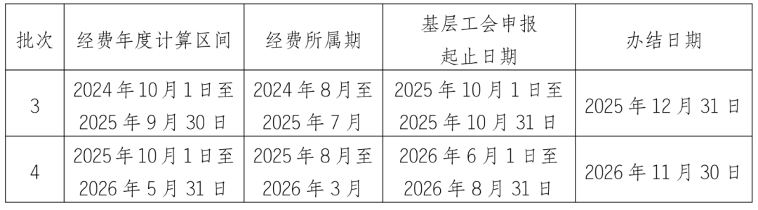 按照新的政策時(shí)限,對(duì)《關(guān)于實(shí)施小額繳費(fèi)工會(huì)組織工會(huì)經(jīng)費(fèi)全額返還支持政策的通知》中的第3批次進(jìn)行調(diào)整,并新增第4批次,具體如下: