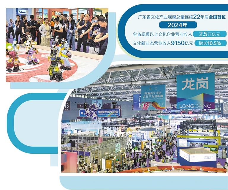 作為我國文化產(chǎn)業(yè)第一大省,廣東省文化產(chǎn)業(yè)規(guī)模總量連續(xù)22年居全國首位。2024年,全省規(guī)模以上文化企業(yè)營業(yè)收入2.5萬億元,約占全國六分之一;文化領(lǐng)域新質(zhì)生產(chǎn)力不斷壯大,文化新業(yè)態(tài)營業(yè)收入9150億元,增長10.5%,在數(shù)字創(chuàng)意、動(dòng)漫游戲、網(wǎng)絡(luò)視聽、數(shù)字文化制造等領(lǐng)域形成較強(qiáng)競爭優(yōu)勢。