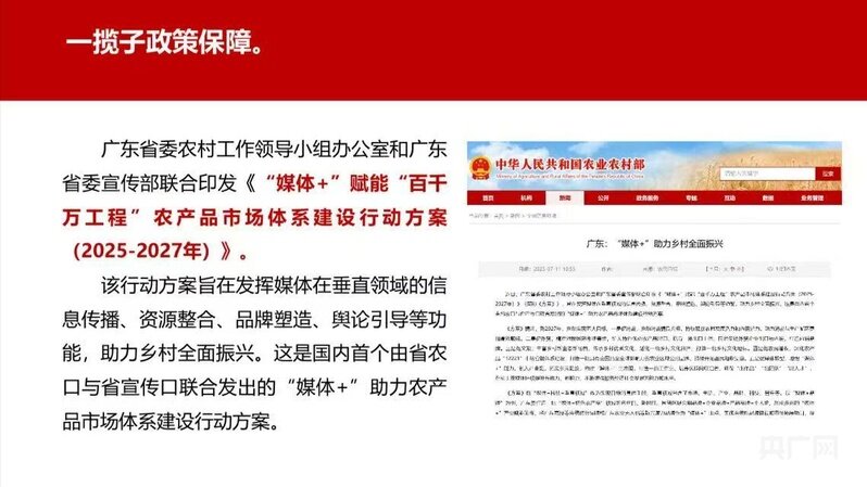 主題發(fā)言中,張璐介紹了廣東在全國首個推出的“媒體+”系統(tǒng)性、常態(tài)化工作機制——《“媒體+”賦能“百千萬工程”農(nóng)產(chǎn)品市場體系建設(shè)行動方案(2025—2027年)》。這個行動方案旨在指導(dǎo)媒體在農(nóng)產(chǎn)品市場營銷、品牌建設(shè)領(lǐng)域發(fā)揮公信力及智庫、傳播、創(chuàng)意等功能,助力鄉(xiāng)村全面振興。