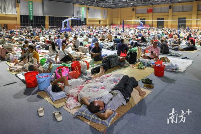 珠海已迅速開放應(yīng)急避難場所。圖為北京理工大學(xué)(珠海)的體育館內(nèi),安置于此的約2000名建筑工友正在休息。南方+記者 鄭新洽 董天健 攝