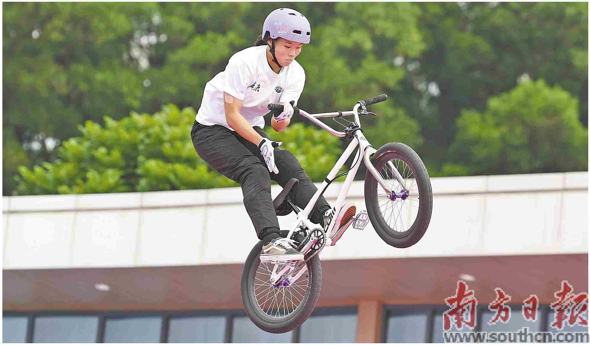 10月25日,廣東隊(duì)選手范曉桐在決賽中。最終,她獲得十五運(yùn)會(huì)自由式小輪車女子公園賽亞軍。新華社發(fā)