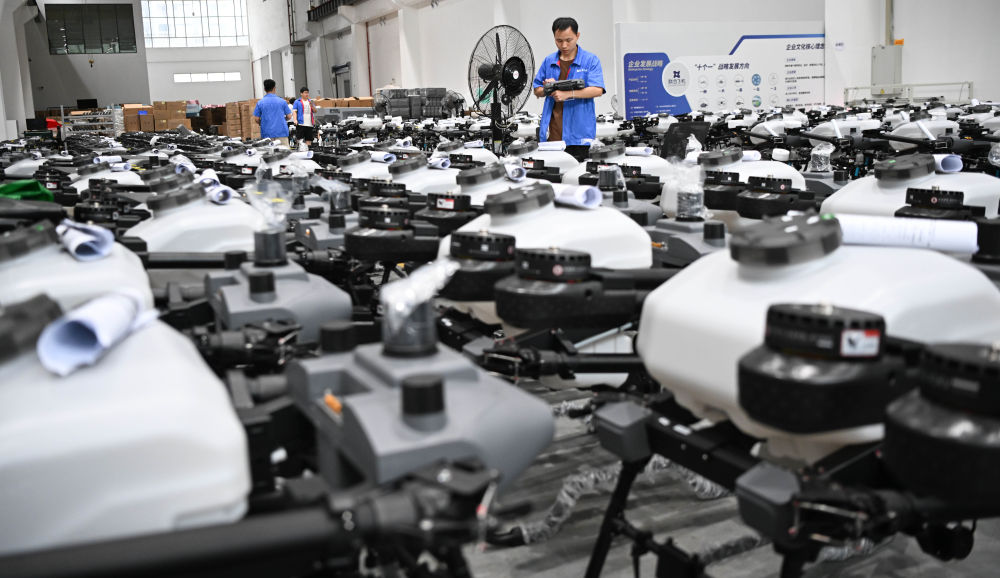 2025年6月26日,工作人員在聯(lián)合飛機集團深圳基地植保無人機倉庫內(nèi)巡視。新華社記者 鄧華 攝