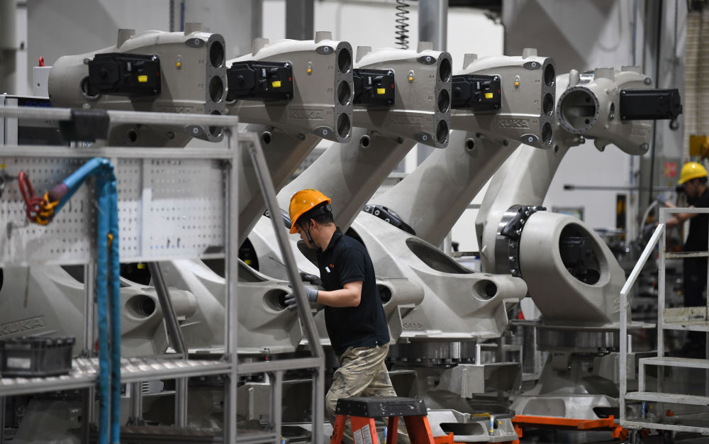 2025年3月25日在廣東佛山市美的庫卡智能制造科技園拍攝的工業(yè)機器人產(chǎn)線車間。新華社記者 鄧華 攝