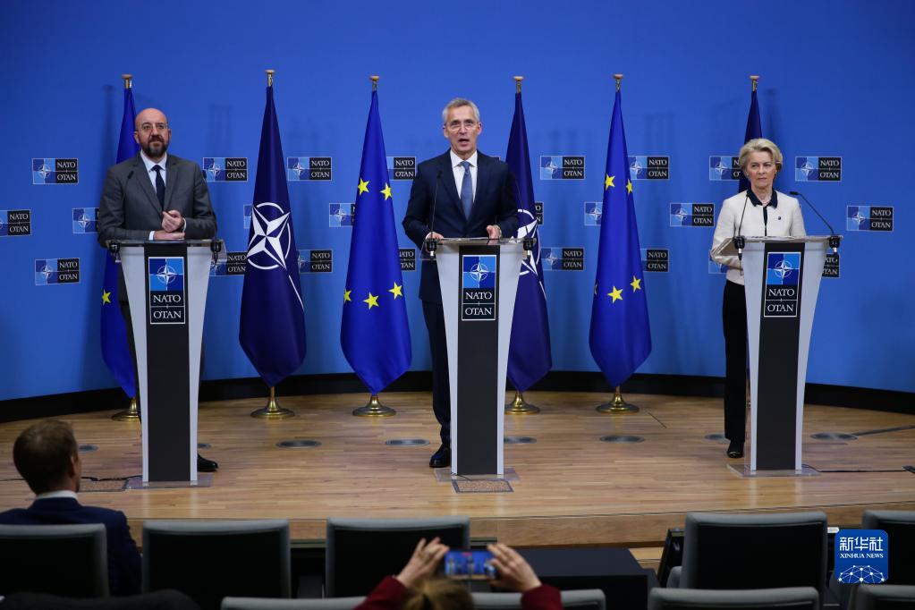 當(dāng)天上午,北約秘書長斯托爾滕貝格、歐洲理事會主席米歇爾和歐盟委員會主席馮德萊恩在北約總部共同出席了宣言簽字儀式。