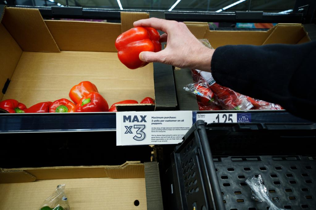 這是2月23日在英國曼徹斯特一家超市拍攝的蔬菜貨架上的限購?fù)ㄖ0凑胀ㄖ棵櫩鸵淮沃荒茏疃噘徺I3個彩椒。新華社發(fā)(喬恩·休珀攝)